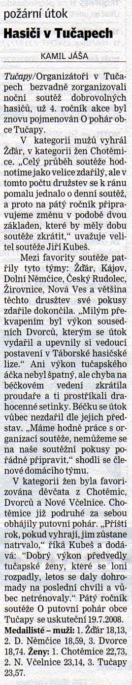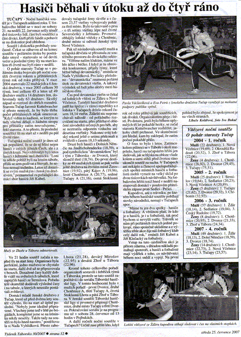 :: Hasiči v Tučapech (článek z noční soutěže, Táborský deník 25.7.2007)