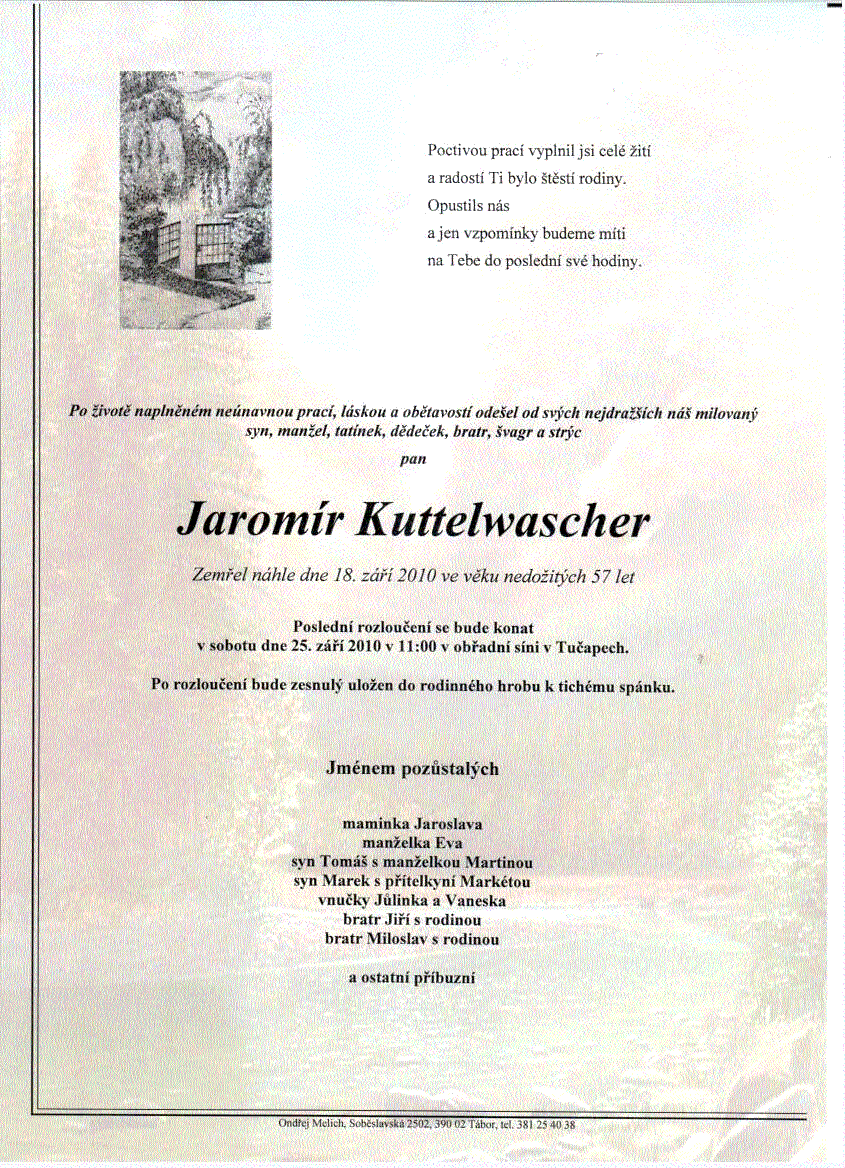 Poslední rozloučení se bude konat v sobotu 25.9.2010 v 11:00 ve smuteční síni v Tučapech. ČEST JEHO PAMÁTCE a PRÁCI!